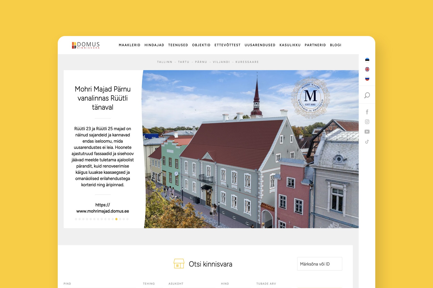 Domuse koduleht keskendub kinnisvaraobjektide müügile. Kujunduspool tuli meile selles projektis väljastpoolt ja saime pühenduda arendusele. Tegime küll ka front-end arenduse, ent projekti tuum oli kodulehe liidestamine kinnisvaraettevõtetele loodud Resolve’i äritarkvaraga. Resolve’iga liidestatud süsteem võimaldab kodulehele paigutada põhjaliku kinnisvaraobjektide otsingu ja alati ajakohase kinnisvaraobjektide ja maaklerite info. See tagab hea kliendikogemuse. Objekte on seejuures lihtne hallata, sest kõik toimub ühes nutikas süsteemis, mitte eraldi objektide andmebaasis ja kodulehel nagu tavaliselt tehakse.