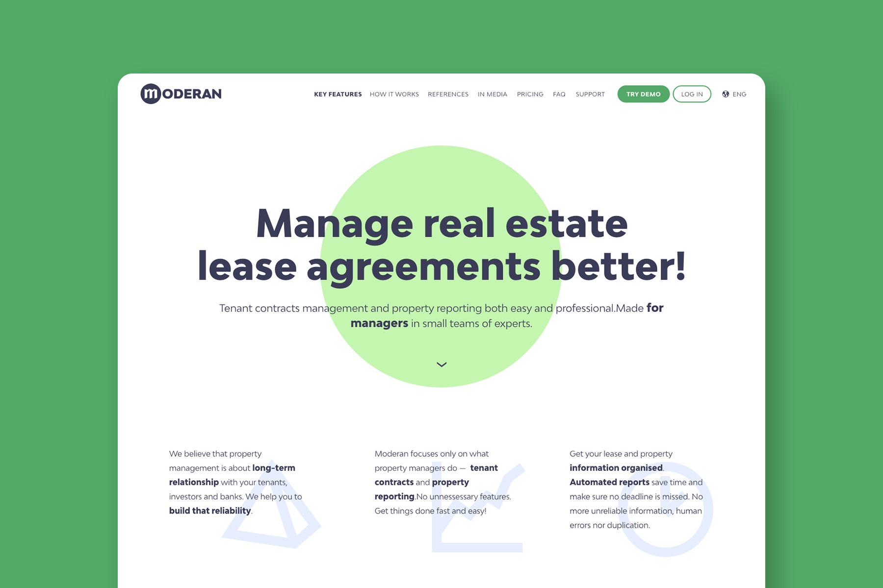 Moderan on kommertskinnisvara halduse veebirakendus, millega kinnisvaraomanik saab hallata rendiportfelli kuuluvate varadega seotud rentnikke, lepinguid ja nendega seotud jooksvaid tegevusi. Meie osalesime projektis kujundus- ja front-end arenduse partnerina.